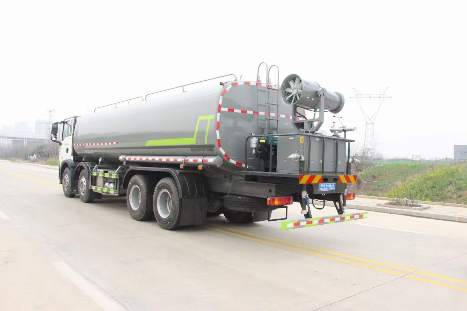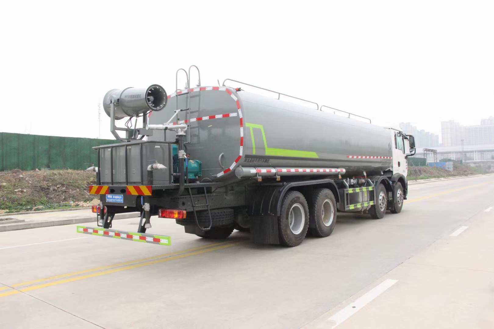 豪沃28方灑水車_重汽豪沃28方抑塵車_重汽曼350霧炮車_湖北盈通專用汽車有限公司,該車用途為城鄉道路和鐵路礦場的抑塵降霾,主要裝置為罐體及噴霧裝置.罐體總容量:22.6立方米,罐體有效容積:21.5立方米;罐體外形尺寸(×長軸×短軸)(mm):7700×2480×1730.ABS系統控制器生產企業/型號為威伯科(上海)管理有限公司/4460046300;選裝EBS,EBS系統控制器生產企業/型號為威伯科(上海)管理有限公司/EBS3.側、后防護材料均為:Q235碳鋼,連接方式均為:螺栓連接,后部防護截面尺寸(mm):120×50,后部防護離地高度(mm):490.僅采用底盤1800+3800+1350軸距(mm)改裝.隨底盤選裝前面罩,選裝后處理樣式,選裝踏步樣式.選裝前部不帶電子霧炮,選裝前部電子霧炮樣式.當前部不帶電子霧炮時,車輛長度11550mm,無前伸;當前部選裝電子霧炮時,車輛長度12050mm,前伸500mm.后軸僅采用鋼板彈簧懸架.選裝自動球閥位置,選裝后對沖裝置,選裝罐體頂部高位花灑裝置,選裝前沖裝置樣式.隨底盤選裝駕駛室.選裝噴霧裝置樣式.選裝箭頭燈裝置,選裝方形罐口及罐口位置,選裝尾部自流口裝置,選裝工具箱裝置.