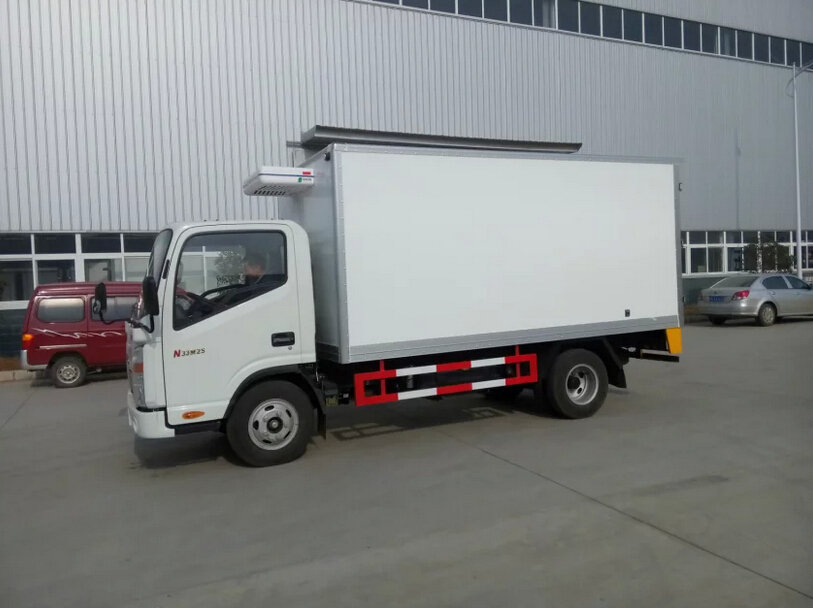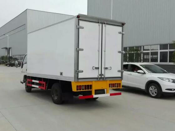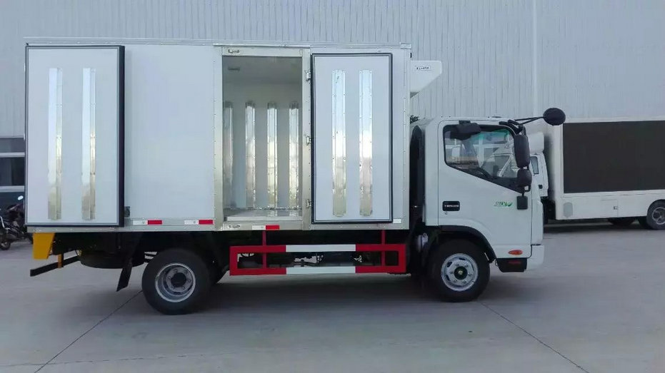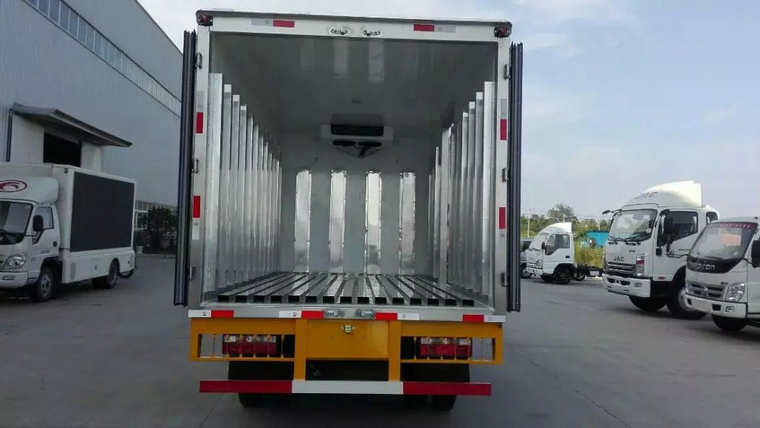 冷藏車廂體:采用國標A級聚氨酯保溫材料,厚度為8厘米,廂體內外采用玻璃鋼材質全包裹。不銹鋼鎖件。包角、包邊鋁合金型材。底盤采用高強度花紋鋁板定制。可選裝肉鉤導軌,和底部通風槽
