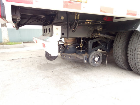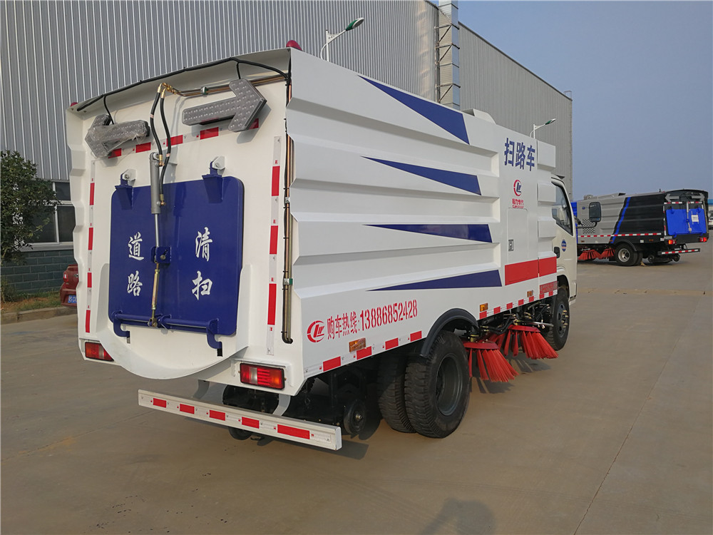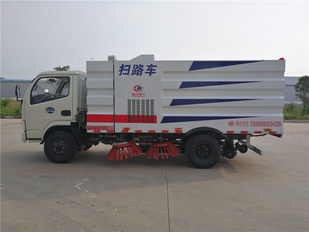 該掃路車采用東風(fēng)多利卡二類底盤改裝,加裝副發(fā)動(dòng)機(jī)、風(fēng)機(jī)、清水箱、垃圾箱、左右立掃、掃盤降塵系統(tǒng),液壓系統(tǒng)、專用裝置電控系統(tǒng)和副車架等改裝而成。