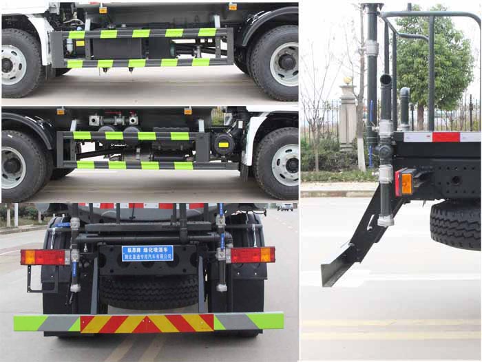 ,該車主要用于城鄉園林綠化噴灑作業;主要裝置為罐體及噴灑裝置.罐體總容量:11.7立方米,罐體有效容積:11.16立方米;罐體外形尺寸(×長軸×短軸)(mm):4200×2450×1650.ABS系統生產廠家及型號分別為:西安正昌電子股份有限公司(型號:ZQFB-V).側、后防護材料均為:Q235碳鋼,連接方式均為:螺栓連接,后部防護截面尺寸(mm):120×50,后部防護離地高度(mm):470.僅采用底盤4000mm軸距改裝.選裝前部不帶電子霧炮,選裝電子霧炮樣式.當前部不帶電子霧炮時,車輛長度7850mm,7600mm,無前伸;當前部選裝電子霧炮時,車輛長度8350mm,8100mm,前伸500mm.選裝大工作平臺,選裝后部噴灑裝置樣式.后軸僅采用鋼板彈簧懸架.